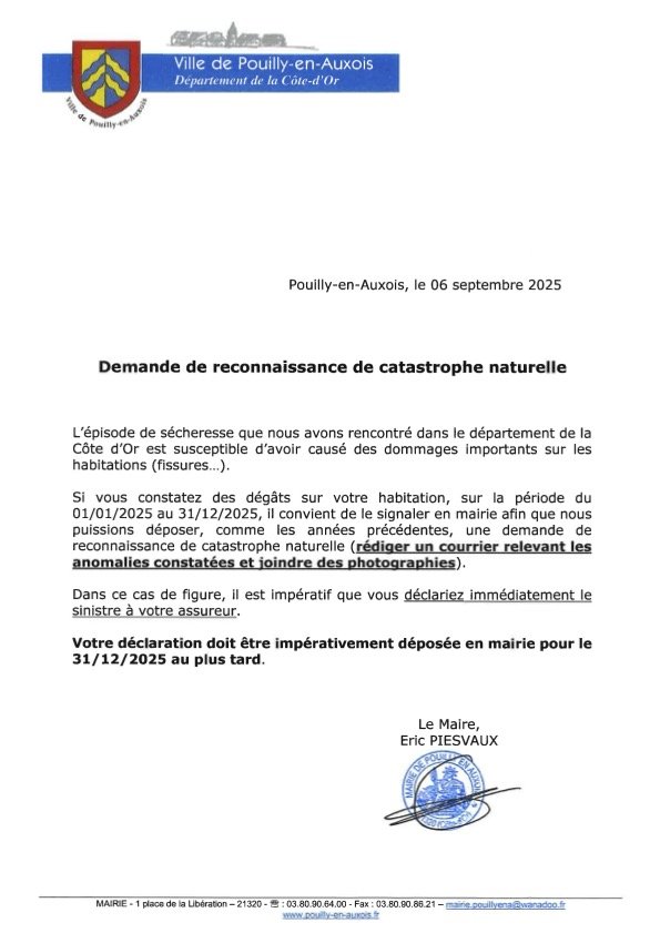 Si vous constatez des dégâts sur votre habitation, sur la période du 01/01/2025 au 31/12/2025, il convient de le signaler en mairie afin que nous puissions déposer, comme les années précédentes, une demande de reconnaissance de catastrophe naturelle (rédiger un courrier relevant les anomalies constatées et joindre des photographies).