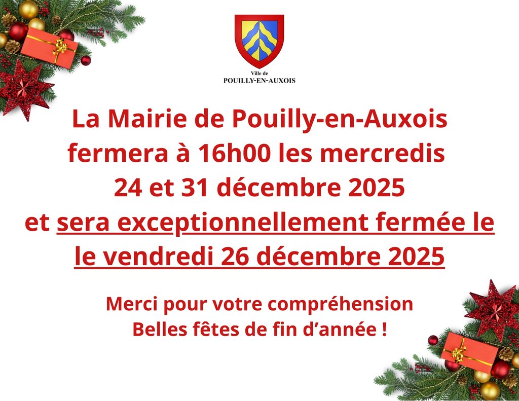 La Mairie de Pouilly-en-Auxois fermera à 16h00 les mercredis 24 et 31 décembre 2025