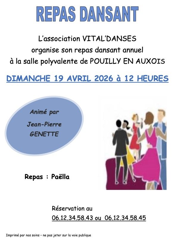 Vital'danses organise un repas dansant (musette) le dimanche 19 avril 2026 à 12 heures à la salle polyvalente de Pouilly en Auxois.